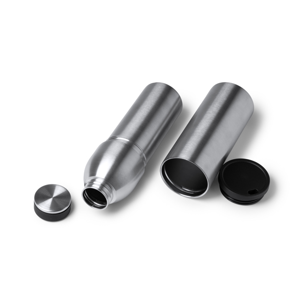 Μπουκάλι θερμός 2 σε 1. Διπλό τοίχωμα με αναδιπλούμενο κύπελλο από ανοξείδωτο ατσάλι 304. Χωρητικότητα φιάλης 650 ml, χωρητικότητα κυπέλλου 500 ml. Συσκευασία σε κουτί με ξεχωριστό σχεδιασμό.