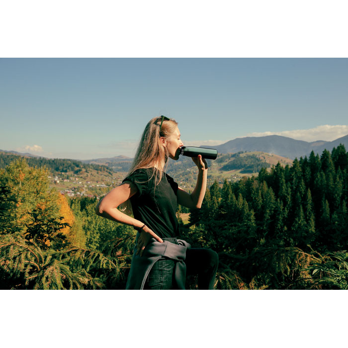 Διαφημιστικό μπουκάλι θερμός με διπλό τοίχωμα από ανακυκλωμένο ανοξείδωτο ατσάλι με μόνωση (90% ανακυκλωμένο ανοξείδωτο ατσάλι και 10% ανοξείδωτο ατσάλι) με ενσωματωμένη λαβή καλωδίου στο καπάκι PP. Χωρίς διαρροές. Χωρητικότητα: 500 ml.