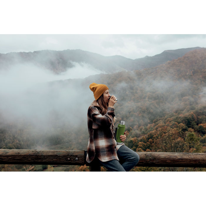 Διαφημιστικό μπουκάλι θερμός με διπλό τοίχωμα, μονωτικό μπουκάλι κενού αέρος από ανακυκλωμένο ανοξείδωτο ατσάλι (90% ανακυκλωμένο ανοξείδωτο ατσάλι και 10% ανοξείδωτο ατσάλι) με λαβή στο πλάι. Με καπάκι PP και κύπελλο από ανακυκλωμένο ανοξείδωτο ατσάλι. Χωρίς διαρροές. Χωρητικότητα: 1 λίτρο.